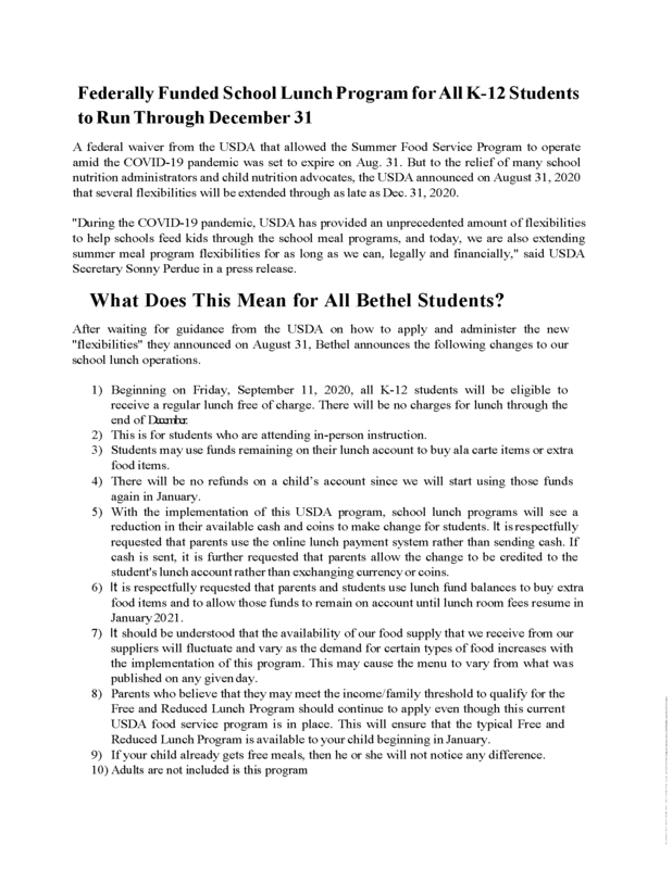 The USDA expanded their state-provided funds to offer FREE lunch to all traditional and free & reduced students until after Christmas break. ALL students attending traditional #BethelLocalSchools will receive FREE lunch starting tomorrow!!